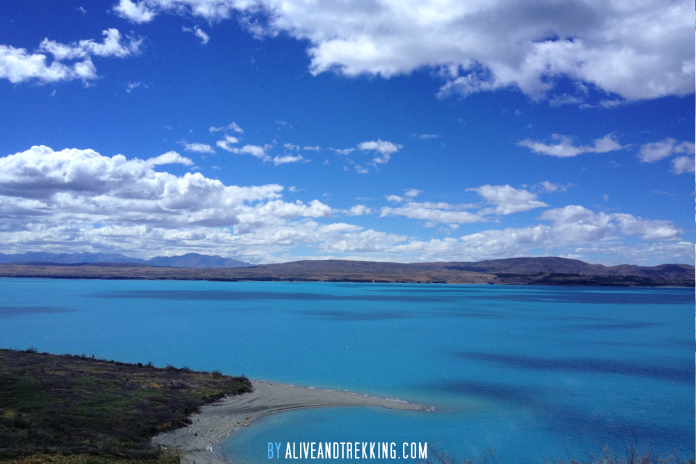Lake Pukaki is a lake with ever changing colours. I’ve seen it in a really bright milky blue, an almost neon turquoise, and now in a deep medium blue with dark spots where clouds cast their shadows. This is one of those lakes that will look different every time you see it. I love it!