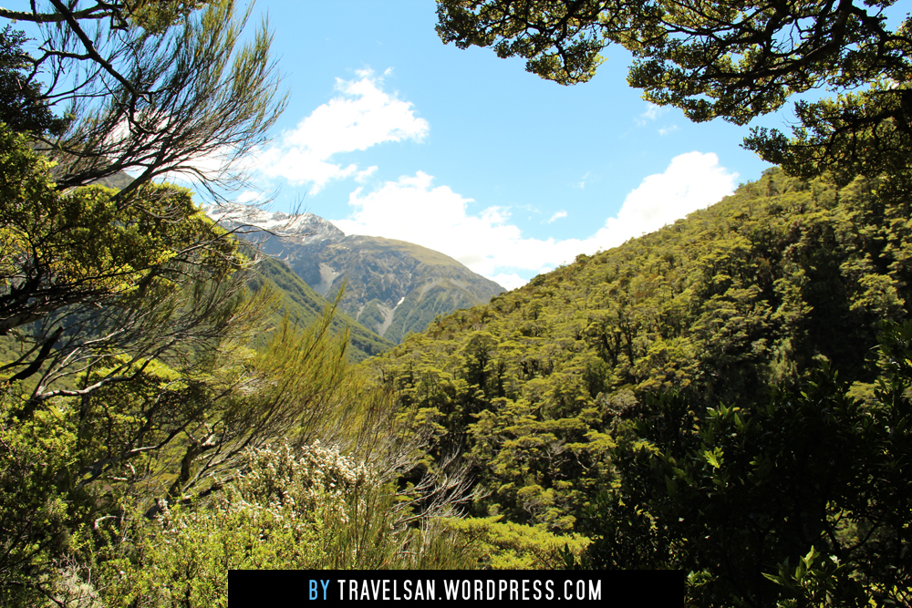 Arthur’s Pass is beautiful. Lush in greens, trees, shrubs…and amazing views! On my way to the Devil’s Punchbowl Falls I saw this view, perfectly framed with trees on all sides. I had to stop for a minute to enjoy it. Okay, maybe more than a minute! 🙂