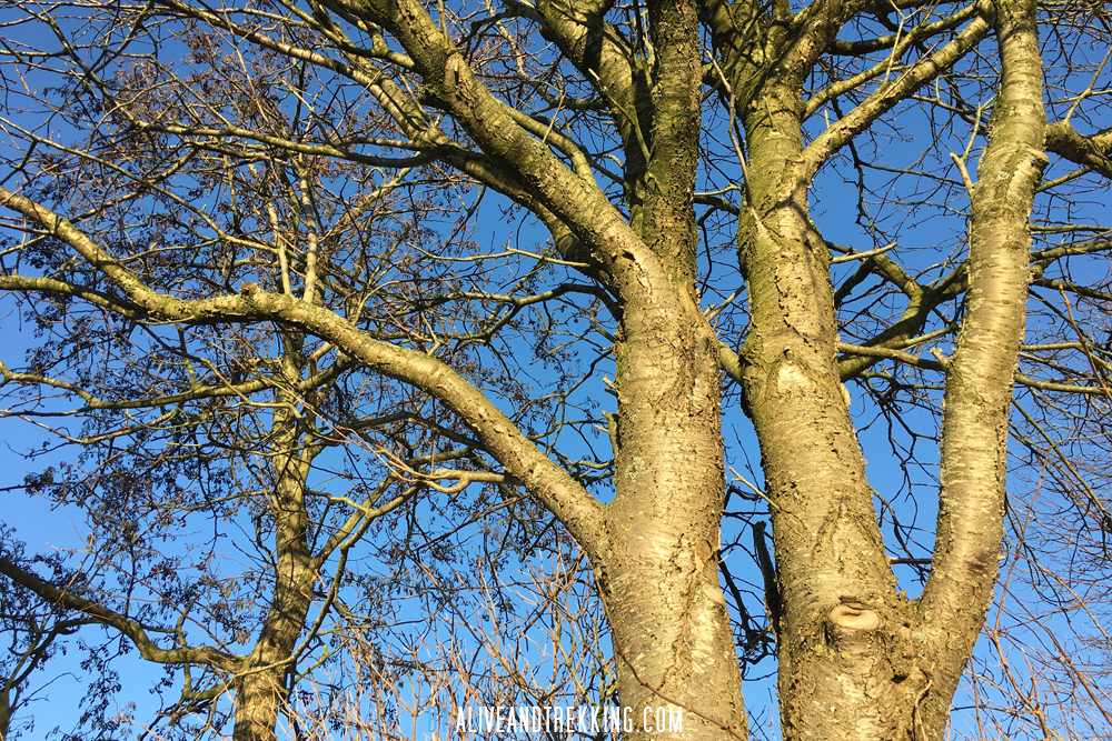 I took this photo last Christmas, when I was out for a stroll with my mom. I love the bright light hitting the trees. And that bright blue sky contrasts with the wood of the trees so nicely.